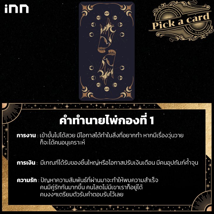 ไม่ว่าจะหยิบหรือเลือกกองไหน สำคัญที่สุดคือเตือนตัวเอง มีสติกับการใช้ชีวิต เพื่อที่จะผ่านเรื่องราวต่างๆ ในช่วงนี้ ถ้าใครที่มีความชอบในการอ่านดวง อยากเสริมดวง เสริมโชคลาภในรูปแบบอื่นๆ สามารถติดตามได้ที่นี่ iNN Horoscope