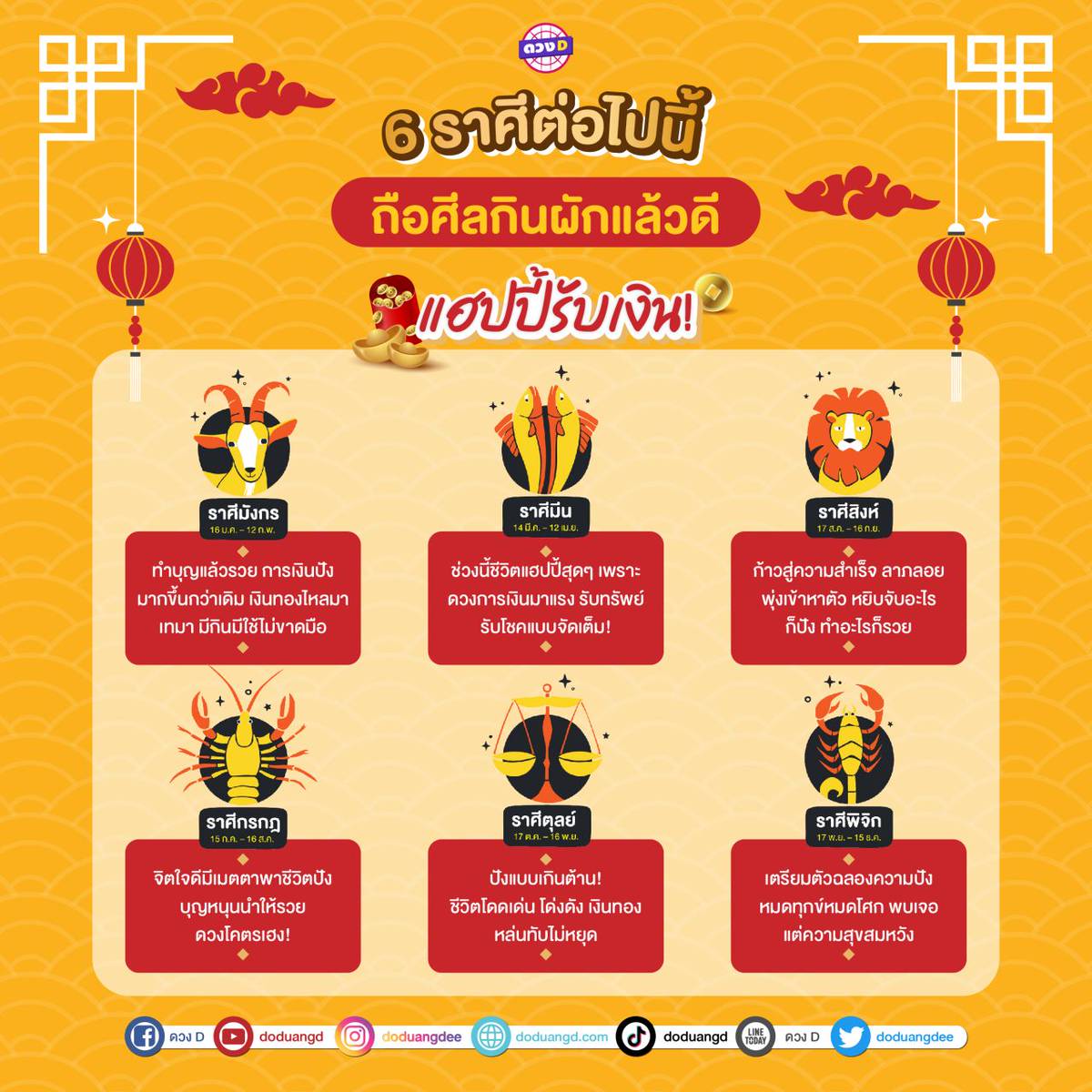 ที่มา : เทศกาลกินเจปีนี้ 6 ราศี ถือศีลกินผักแล้วดี แฮปปี้รับเงิน เตรียมตัวรับความปัง !! | ดวง D | LINE TODAY