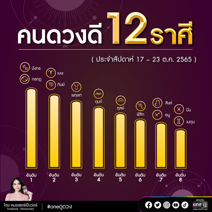 ที่มา : จัดอันดับคนดวงดี 12 ราศี ช่วง 17 - 23 ต.ค. 65 โดย หมอเชอร์ เป๊ะเวอร์ (sanook.com)