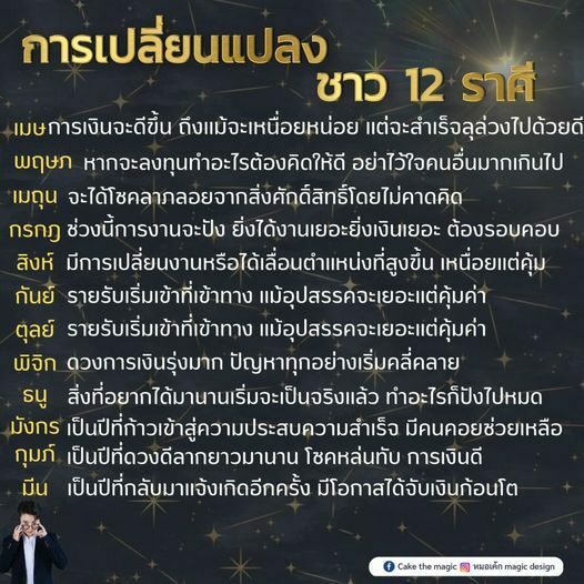 ในช่วงนี้ดวงชะตาของแต่ละราศีมีการเปลี่ยนแปลง โดยอาจเปลี่ยนแปลงทั้งในทางที่ดีและเปลี่ยนแปลงในทางต้องระมัดระวัง ในเดือนเมษายนนี้ เป็นช่วงปีใหม่ไทย ล่าสุด “หมอเค้ก Magic design” การเปลี่ยนแปลงของดวงทั้ง 12 ราศี ในเดือนนี้