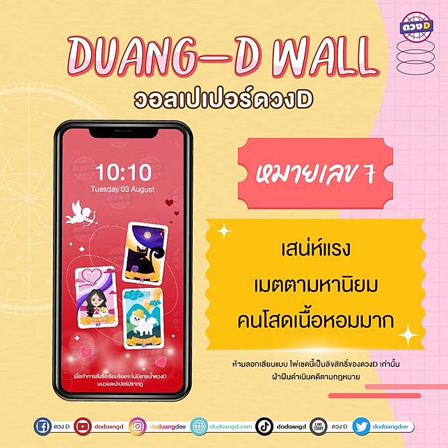 วอลเปเปอร์ หมายเลข 7 กันยา 66 : เชื่อว่าหลายๆคนนั้นต้องการที่จะหาคู่ หรือต้องการเพิ่มเสน่ห์ให้กับตัวเอง เพื่อให้ความรักนั้นสมดังที่ต้องการ เเละอยากที่จะสละโสดสักที นี่เลยครับ วอลเปเปอร์นี้เลยสำหรับคนโสดอย่างเราๆ ผมเเนะนำเป็นอย่างมากเพราะจะช่วยเสริมสร้างให้คุณนั้นมีเสนห์เเรง มีเมตตามหานิยม เเละยิ่ง3 ราศีนี้ เมษ ธนู มีน ที่ได้ครอบครองวอลเปเปอร์นี้ จะยิ่งเสน่ห์เเรงมากผู้ชายต่อเเถวเรียงคิวเพื่อที่จะจีบยาวเป็นหางว่าวเเน่นนอน