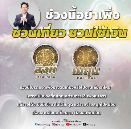 สำหรับ 2 ราศี ประกอบด้วย ราศีสิงห์ ราศีเมถุน โดยทั้ง 2 ราศีนี้ ช่วงนี้อย่าเพิ่งชวนเที่ยว ชวนใช้เงิน