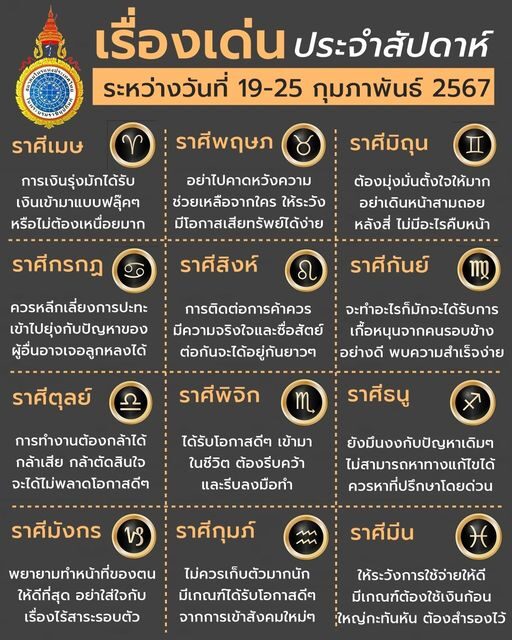 เมื่อวันที่ 20 กุมภาพันธ์ ผู้สื่อข่าวรายงานว่า เพจ “สมาคมโหรแห่งประเทศไทย ในพระบรมราชินูปถัมภ์” โพสต์ข้อความ เปิดเรื่องเด่นของ 12 ราศี ส่งท้ายสัปดาห์สุดท้ายเดือนกุมภาพันธ์ โดยมีรายละเอียด ดังนี้