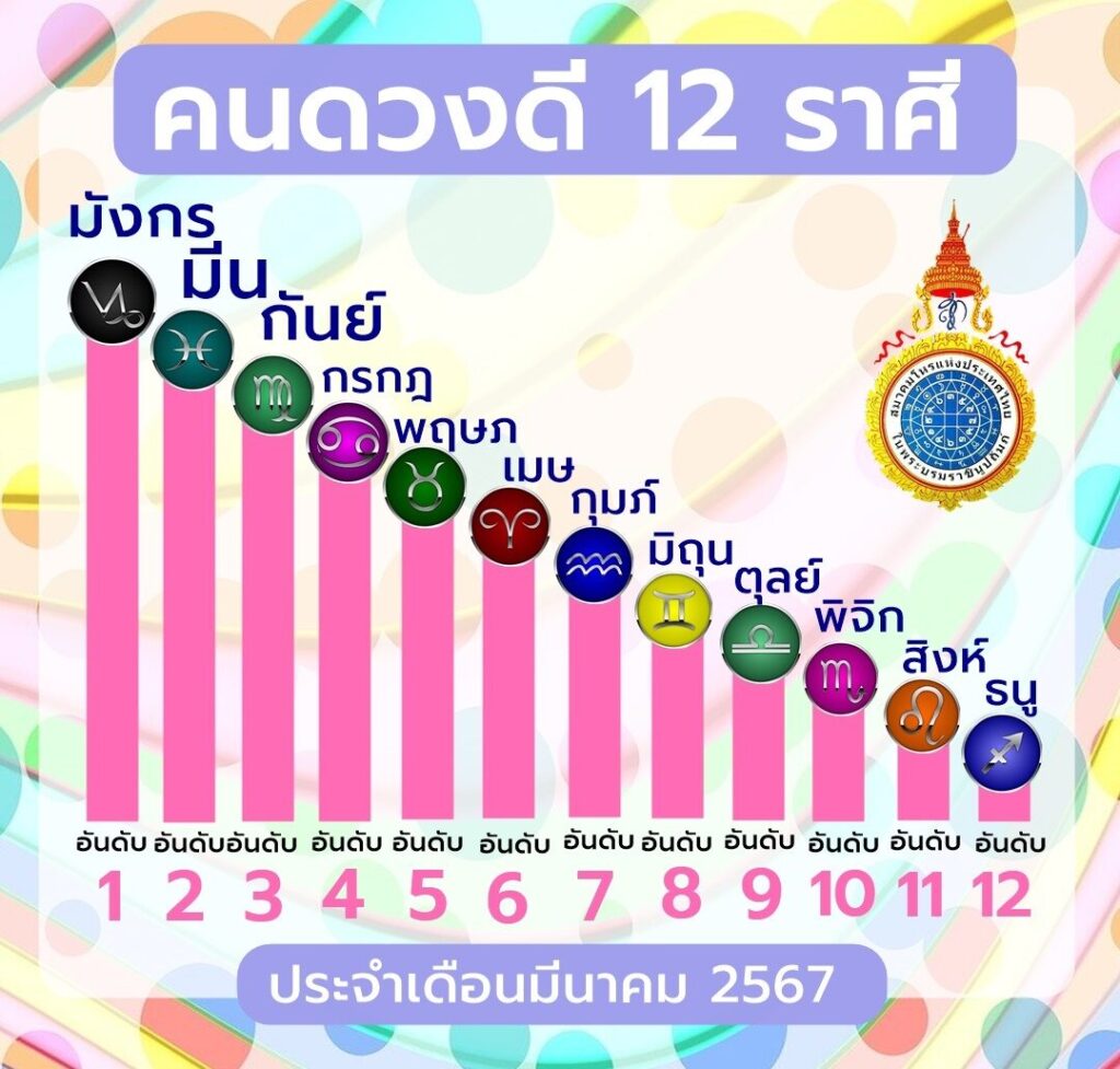 เมื่อวันที่ 6 มีนาคม ผู้สื่อข่าวรายงานว่า สมาคมโหรแห่งประเทศไทยฯ ได้จัดอันดับคนดวงดี 12 ราศี ประจำเดือนมีนาคม 2567 ไว้ดังนี้