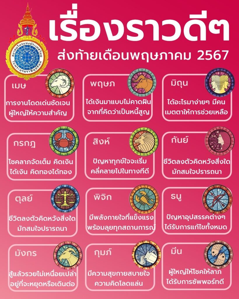 เมื่อวันที่ 25 พฤษภาคม ผู้สื่อข่าวรายงานว่า เข้าสู่โค้งสุดท้ายเดือนพฤษภาคมที่ยังเหลือเวลาอีกประมาณ 6 วัน สมาคมโหรแห่งประเทศไทยฯ ได้ เปิด เรื่องราวดีๆ ของชาว 12 ราศี ส่งท้ายเดือนพฤษภาคม 2567 ไว้ดังนี้