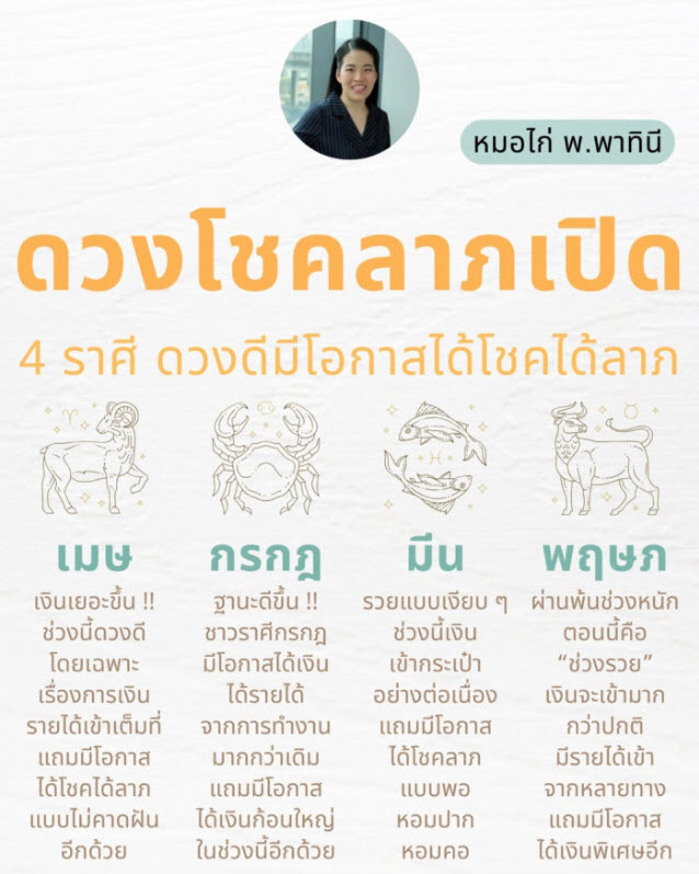 หมอไก่ พ.พาทินี หมอดูชื่อดัง โพสต์ข้อความระบุว่า ถึงคิวได้โชคลาภ!! 4 ราศี ดวงการเงินดี ได้โชคได้ลาภ เงินทองหลั่งไหล ร่ำรวยแบบไม่รู้ตัว