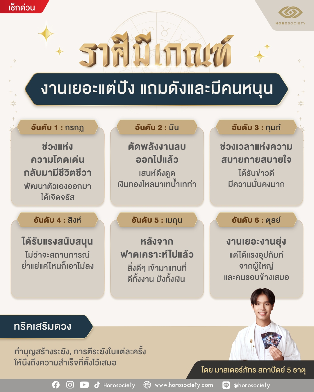 มาสเตอร์ภัทร ทำนายทายทักถึงราศีมีเกณฑ์งานเยอะแต่ปัง แถมดังและมีคนหนุน เป็นช่วงเวลาแห่งความโดดเด่น มีแรงอุปภัมภ์ สำหรับราศีใดบ้าง ไปดูกันเลย