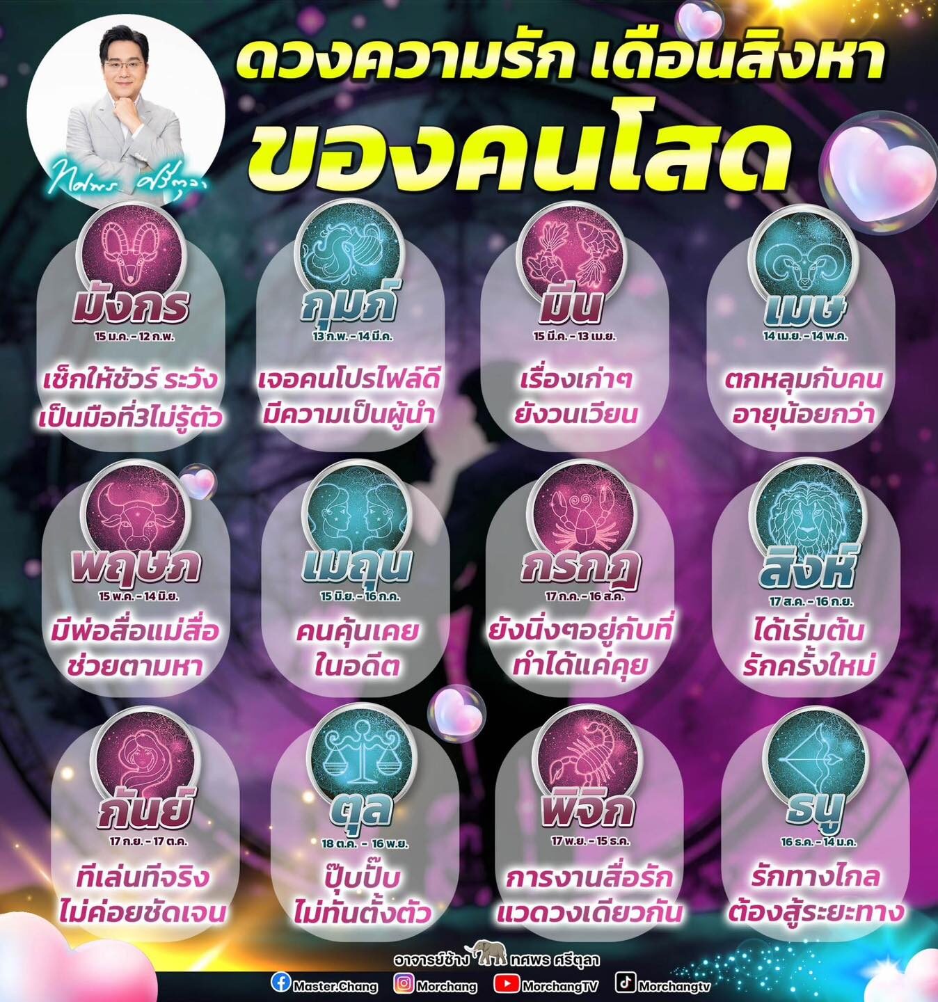 เมื่อเร็วๆ นี้ หมอช้าง ทศพร ได้เปิดดวงอัพเดทความรักของคนโสดประจำเดือน สิงหาคม ผ่านทางเพจ “หมอช้าง ทศพร ศรีตุลา” ซึ่งมีรายละเอียดดังนี้