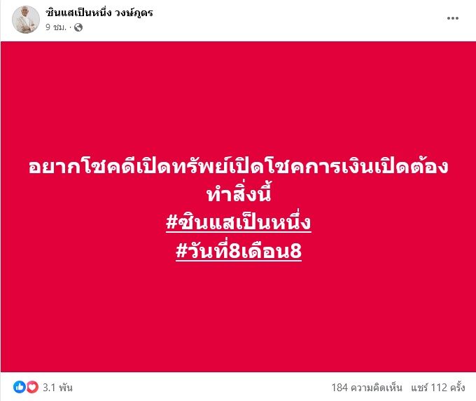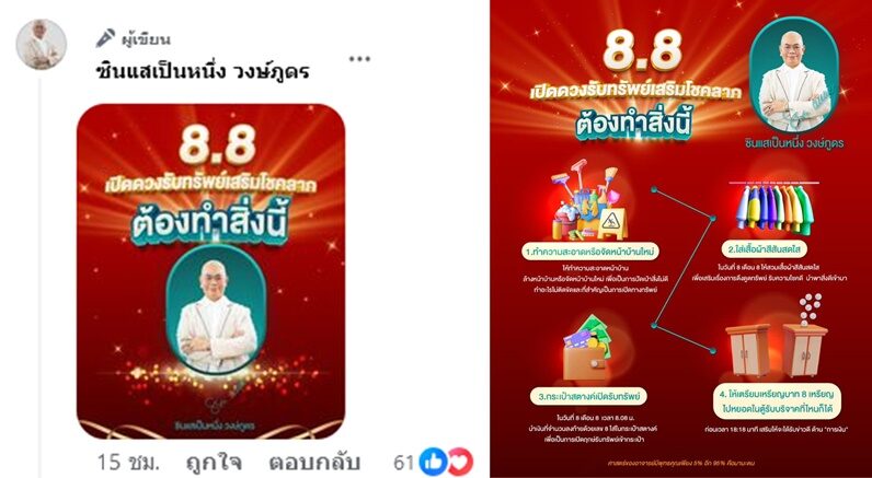 ซินแสเป็นหนึ่ง แนะทำ 4 ข้อ 8.8 เปิดดวงรับทรัพย์เสริมโชคลาภ จะได้รับข่าวดีด้านการเงิน เปิดทางทรัพย์ ปัดเป่าสิ่งไม่ดี ทำอะไรไม่ติดขัด