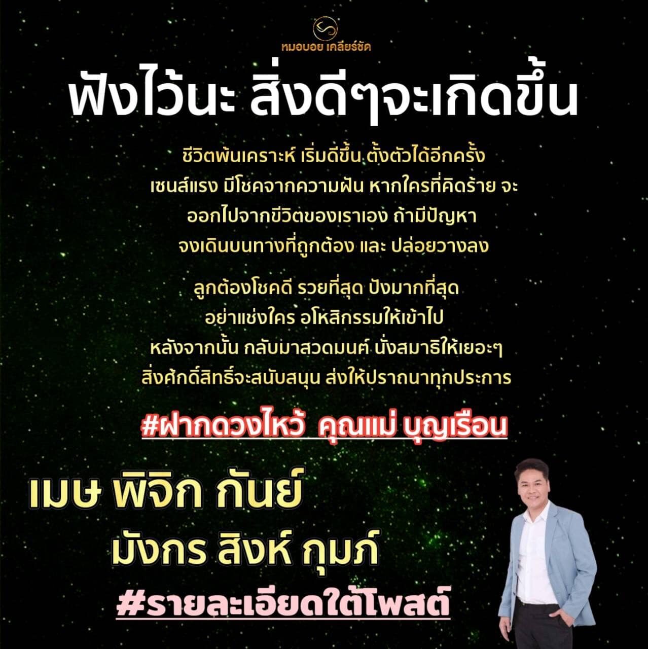 หมอบอย เคลียร์ชัด เผยถึงดวงชะตาที่สิ่งดีๆ จะเกิดขึ้น ชีวิตพ้นเคราะห์ เริ่มดีขึ้น ตั้งตัวได้อีกครั้ง มีโชคจากความฝัน หากใครที่คิดร้ายจะออกไปจากชีวิตของเราเอง ถ้ามีปัญหาจงเดินบนทางที่ถูกต้อง และปล่อยวางลง