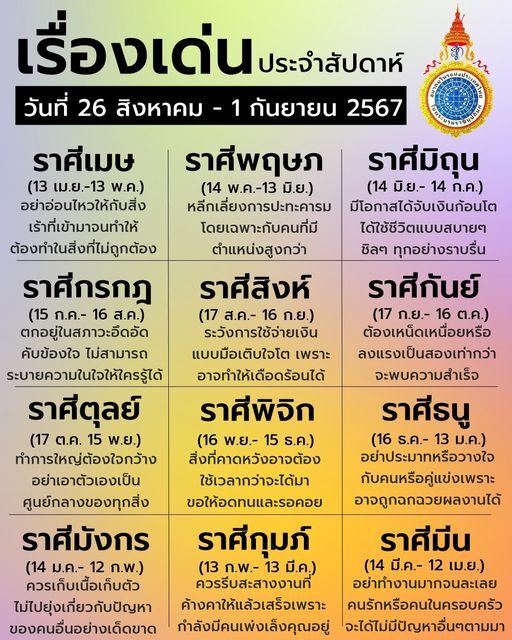 โค้งสุดท้าย ส่งท้ายเดือนสิงหาคม สมาคมโหรแห่งประเทศไทยฯ เปิดเรื่องเด่นประจำสัปดาห์ (26 ส.ค.-1ก.ย.) ครบทั้ง 12 ราศีไว้ดังนี้