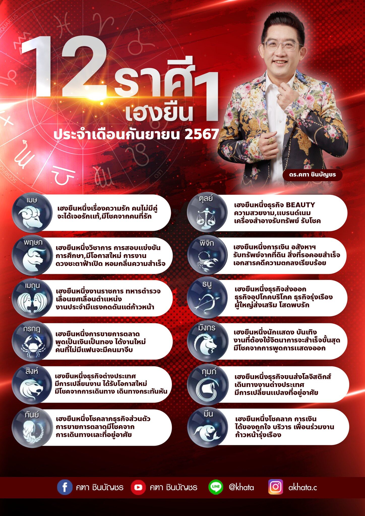 คฑา ชินบัญชร เปิดดวงชะตา 12 ราศี เฮงยืน 1 ประจำเดือนกันยายน 2567 เตรียมรับโชคลาภ การเงินได้ของที่ถูกใจ บริวาร เพื่อนร่วมงานก้าวหน้ารุ่งเรือง