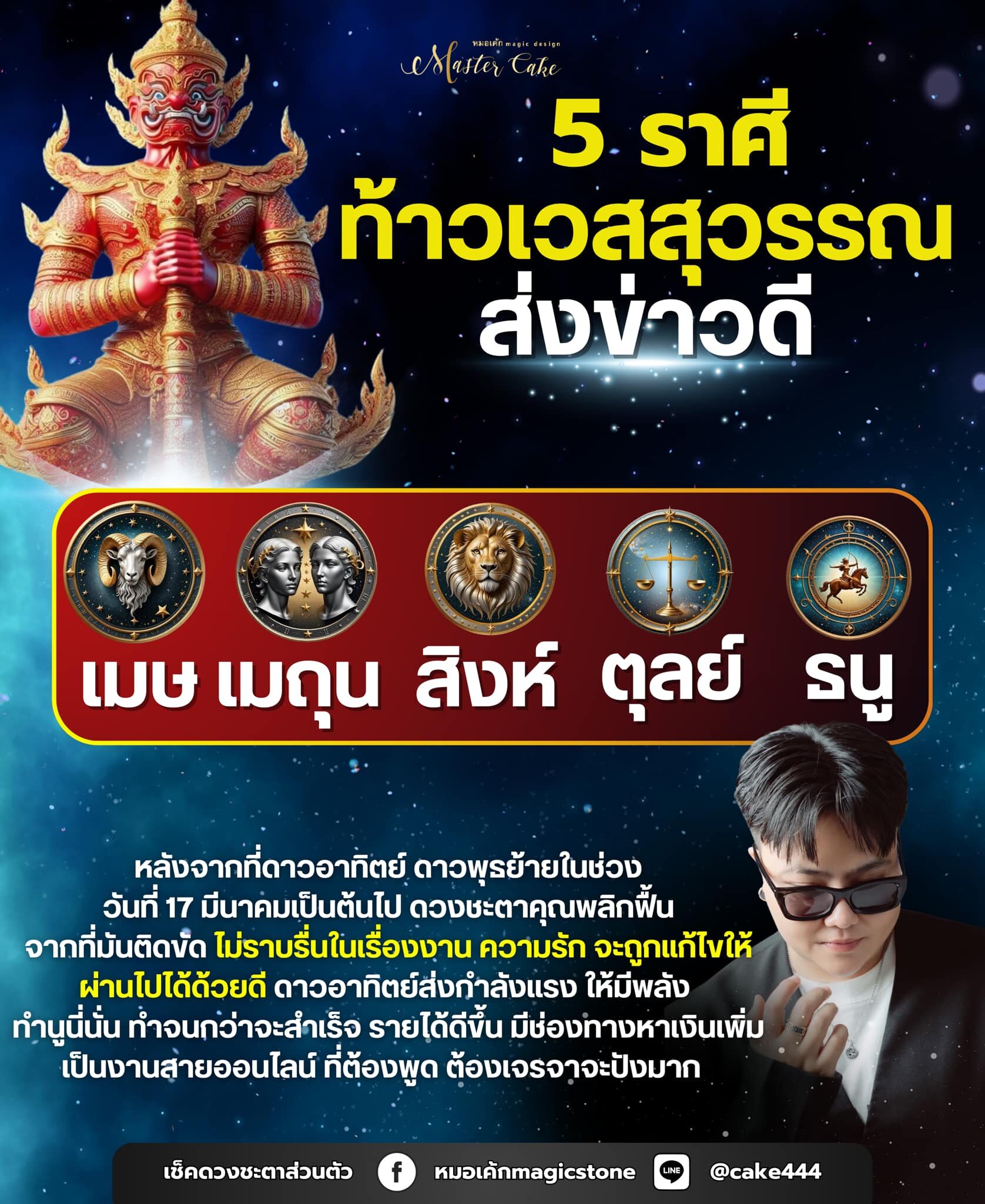 สำหรับ 5 ราศี ประกอบด้วย ราศีเมษ ราศีเมถุน ราศีสิงห์ ราศีตุลย์ ราศีธนู โดยทั้ง 5 ราศี ท้าวเวสสุวรรณ ส่งข่าวดี หลังจากที่ดาวอาทิตย์ ดาวพุธย้ายในช่วงวันที่ 17 มี.ค.2568 เป็นต้นไป