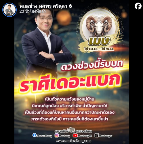 เช็กดวงช่วงนี้ จาก หมอช้าง ทศพร ศรีตุลา ที่ล่าสุดได้โพสต์คำทำนายผ่านทางเฟซบุ๊ก Master.Chang เผยถึงราศีที่ในช่วงนี้ ต้องรับบทเป็นเดอะแบกสุด ๆ ต้องคอยแก้ปัญหาให้ทั้งตัวเอง และปัญหาของคนอื่น ได้แก่ ราศีเมษ