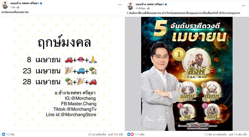 ดวงดีรับปีใหม่ไทย สงกรานต์นี้ ราศีใดบ้างรับความปัง หมอช้าง ทศพร โพสต์ “5 อันดับราศีดวงดีเดือนเมษายน” ดังนี้