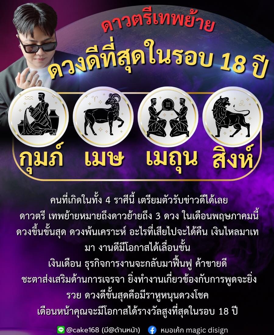 หมอเค้กMagicdesign เผยถึงดวงชะตาราศี ดาวตรีเทพย้าย ดวงดีที่สุดในรอบ 18 ปี คนที่เกิด 4 ราศีนี้ เตรียมตัวรับข่าวดีได้เลย ดาวตรีเทพย้ายหมายถึง ดาวย้ายถึง 3 ดวง ในเดือนพ.ค.นี้ ดวงขึ้นขั้นสุด ดวงพ้นเคราะห์ อะไรที่เสียไปจะได้คืน เงินไหลมาเทมา งานดีมีโอกาสได้เลื่อนขั้น เงินเดือน ธุรกิจการงานจะกลับมาฟื้นฟู ค้าขายดี ชะตาส่งเสริมด้านการเจรจา ยิ่งทำงานเกี่ยวกับการพูดจะยิ่งรวย ดวงดีขึ้นคือ มีราหูหนุนดวงโชค เดือนหน้าคุณจะมีโอกาสได้รางวัลสูงสุดรอบ 18 ปี