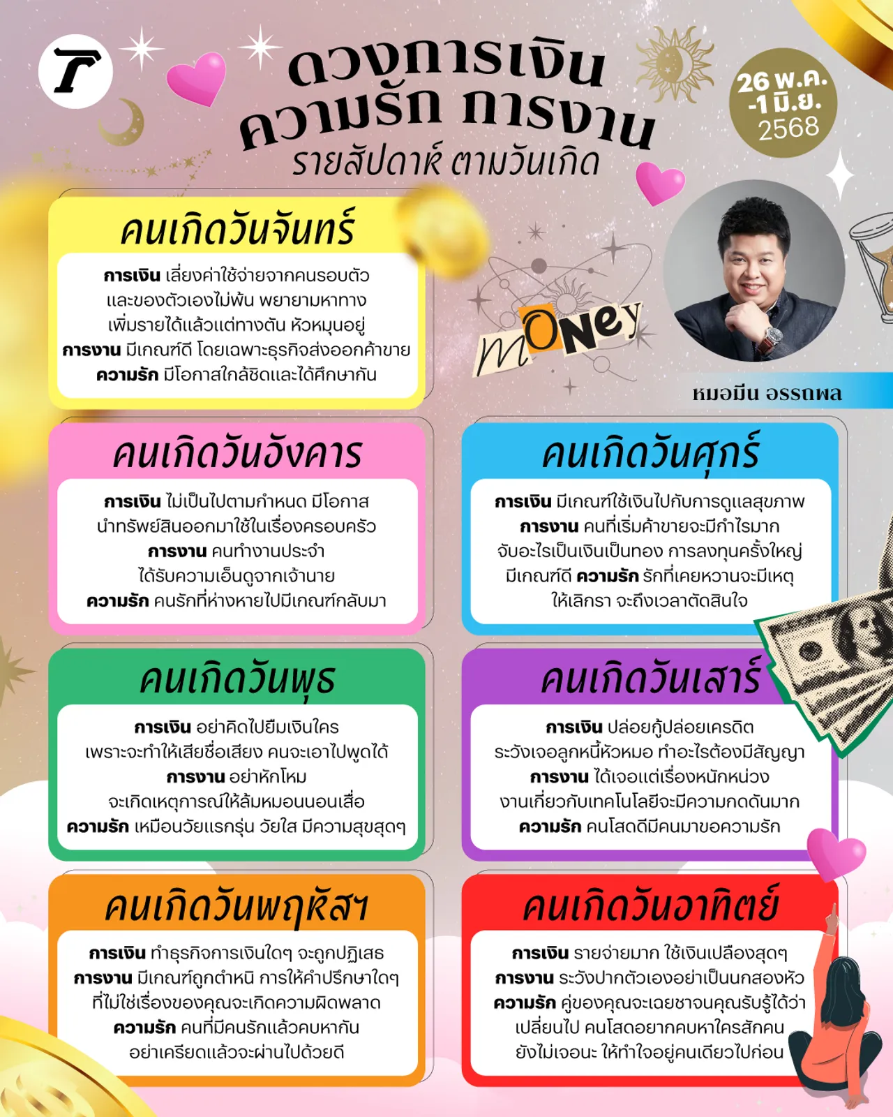 ที่มา : ดวงตามวันเกิดสุดปัง 26 พ.ค. - 1 มิ.ย. 2568 เช็กวันดี มีโชคลาภรับทรัพย์ใหญ่