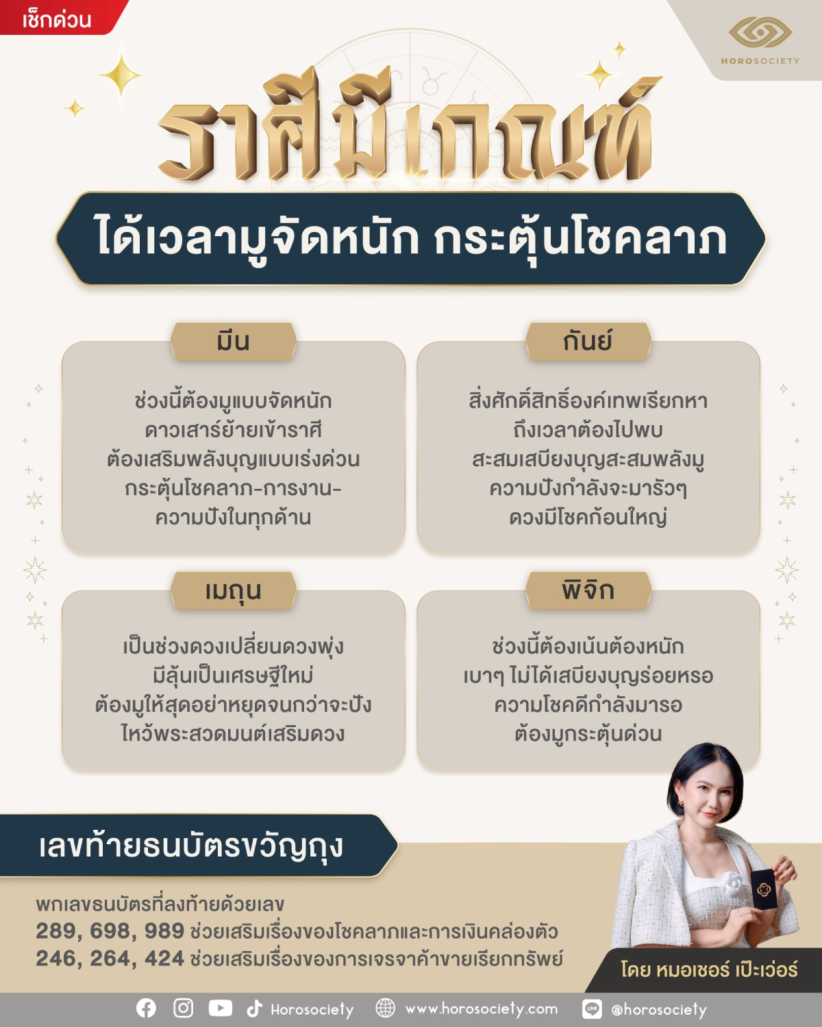 ที่มา : ราศีมีเกณฑ์ ได้เวลามูจัดหนัก กระตุ้นโชคลาภ โดย หมอเชอร์ เป๊ะเว่อร์