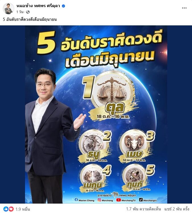 หลังจากผ่านช่วงดาวตรีเทพย้ายใหญ่ไปเมื่อเดือนที่แล้ว เมษายน เข้าสู่เดือนมิถุนายน แล้ว หมอช้าง ทศพร โพสต์ 5 อันดับราศีดวงดีเดือนมิถุนายน ดังนี้