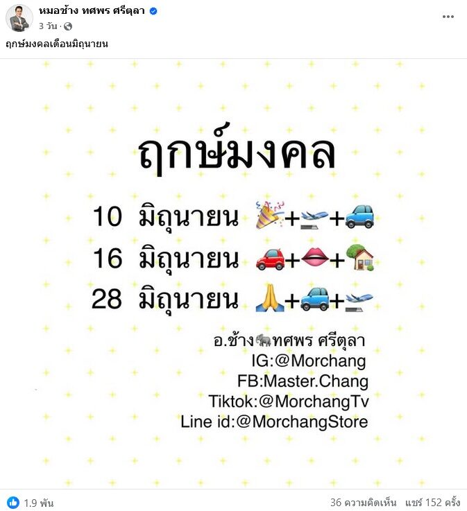 พร้อมทั้งโพสต์ ฤกษ์มงคลเดือนมิถุนายน 3 วันดังนี้