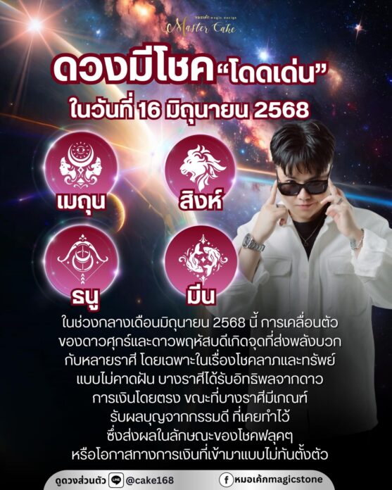 หมอเค้ก Magic stone เผยถึง 4 ราศี ดวงมีโชค “โดดเด่น” ในวันที่ 16 มิถุนายน 2568 ถือเป็นวันแห่ง พลังโชคลาภ ที่เกิดจากจังหวะ การโคจรของดาวสำคัญหลายดวงที่ทำมุม เกื้อหนุนกับเรือนการเงิน โชคลาภ และโอกาสโชคที่ได้รับในครั้งนี้