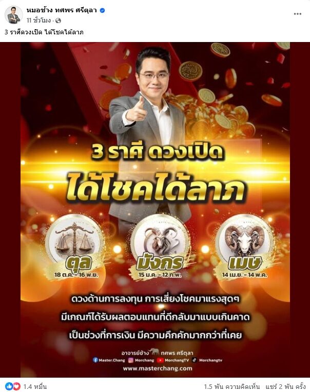นักเสี่ยงโชคต้องฟังเลยวันนี้หวยออก ใครจะมีดวงโชคลาภแบบปังๆ หมอช้าง ทศพร โพสต์ก่อนวันหวยออกว่า “3 ราศีดวงเปิด ได้โชคได้ลาภ”