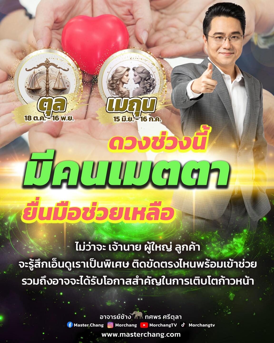 เมื่อวันที่ 14 กรกฎาคม ผู้สื่อข่าวรายงานว่า หมอช้าง ทศพร หมอดูชื่อดังโพสต์ภาพและข้อความลงในเพจ “หมอช้าง ทศพร ศรีตุลา“ระบุว่า ราศี…ดวงช่วงนี้มีคนเมตตา ยื่นมือช่วยเหลือ