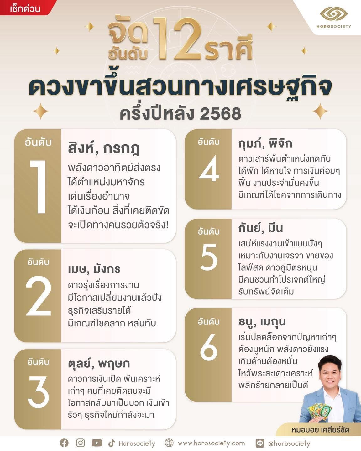 หมอบอย เคลียร์ชัด จัดอันดับ 12 ราศี ดวงขาขึ้นสวนทางเศรษฐกิจ ครึ่งปีหลัง 2568 พลังดาวอาทิตย์ส่งตรง ได้ตำแหน่งมหาจักร เด่นเรื่องอำนาจ ได้เงินก้อน สิ่งที่เคยติดขัดจะเปิดทางคนรวยตัวจริง