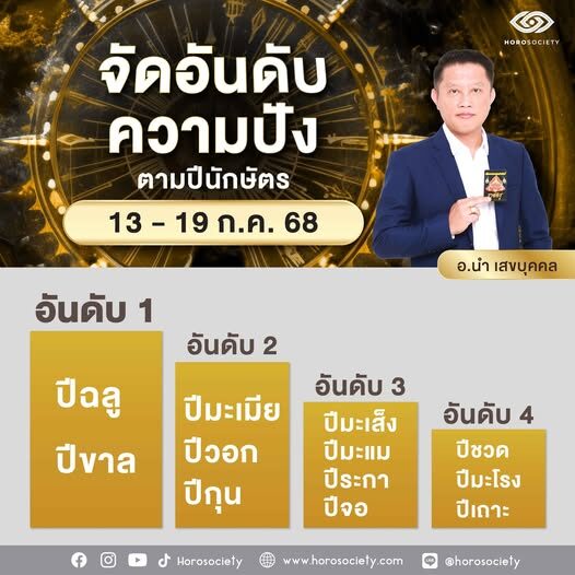 อ.นำ เสขบุคคล เผยในเพจ ดูดวงไพ่เทพนิมิต โดย อ.นำ เสขบุคคล จัดอันดับความปังปีนักษัตร รายสัปดาห์ช่วงวันที่ 13-19 กรกฏาคม 2568
