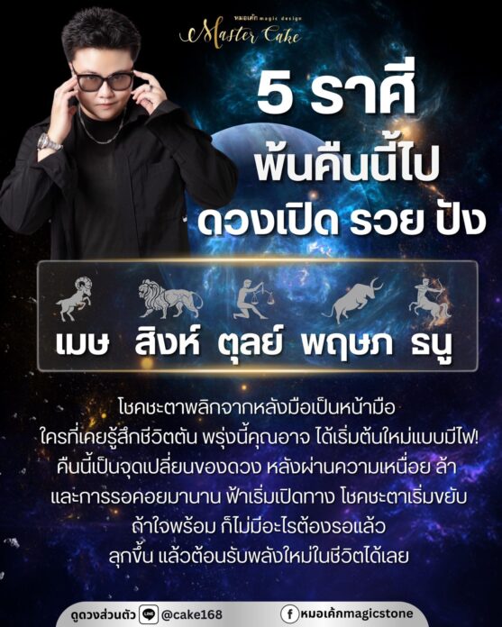 หมอเค้กMagic stone เผยถึง 5 ราศี พ้นคืนนี้ไป ดวงเปิด รวย ปัง โชคชะตาพลิกจากหลังมือเป็นหน้ามือ ใครที่เคยรู้สึกชีวิตตัน พรุ่งนี้คุณอาจได้เริ่มต้นใหม่แบบมีไฟ