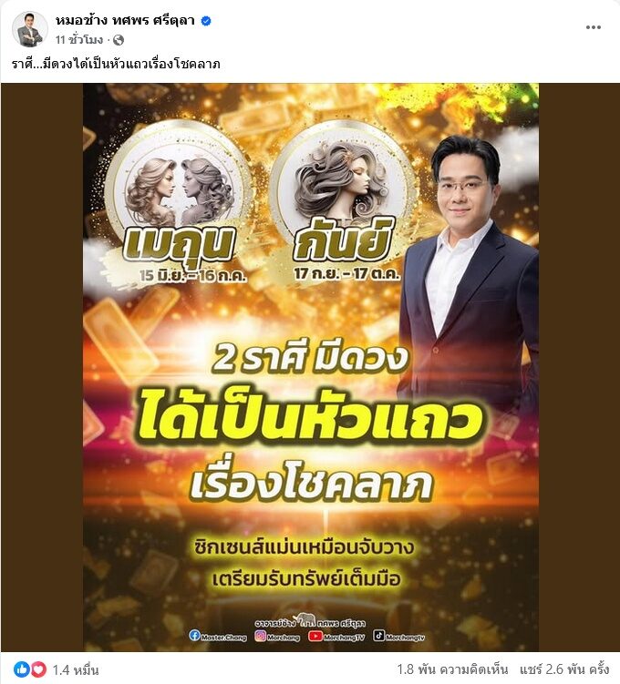ใกล้ช่วงเวลาเสี่ยงโชคลาภวันที่ 16 ส.ค.68 เสาร์นี้แล้วด้วย หมอช้าง ทศพร โพสต์ถึงดวงชะตา 2 ราศี ทำเอามีลุ้นเลยว่า “ราศี…มีดวงได้เป็นหัวแถวเรื่องโชคลาภ”