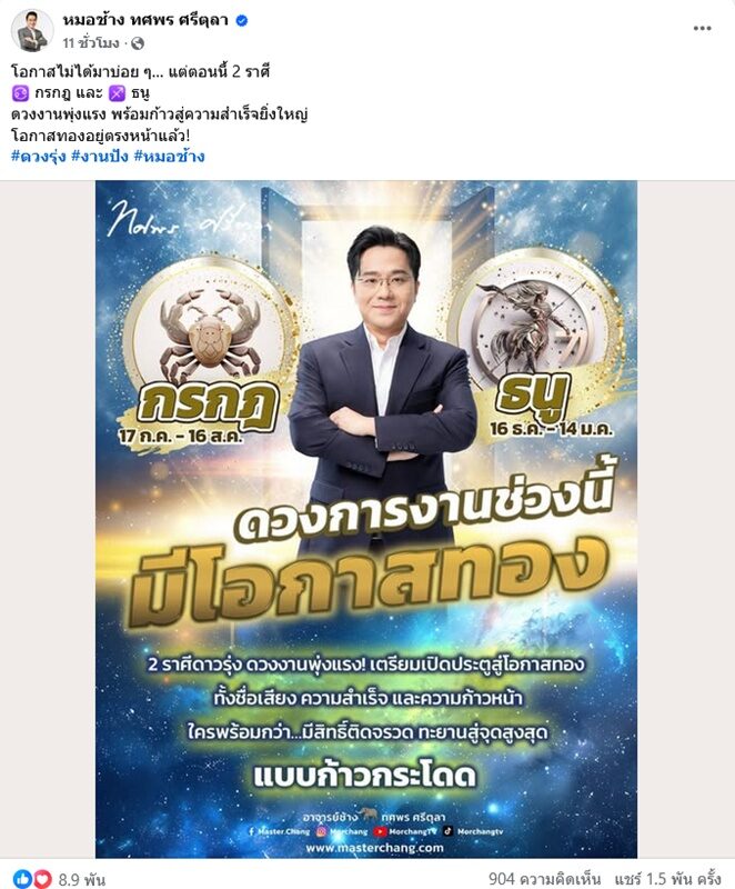 มีเรื่องดีๆในช่วงนี้ หมอช้าง ทศพร โพสต์แจ้งข่าวดีสำหรับ 2 ราศีว่า “โอกาสไม่ได้มาบ่อยๆ… แต่ตอนนี้ 2 ราศี กรกฎ และ ธนู ดวงงานพุ่งแรง พร้อมก้าวสู่ความสำเร็จยิ่งใหญ่ โอกาสทองอยู่ตรงหน้าแล้ว! #ดวงรุ่ง #งานปัง #หมอช้าง”
