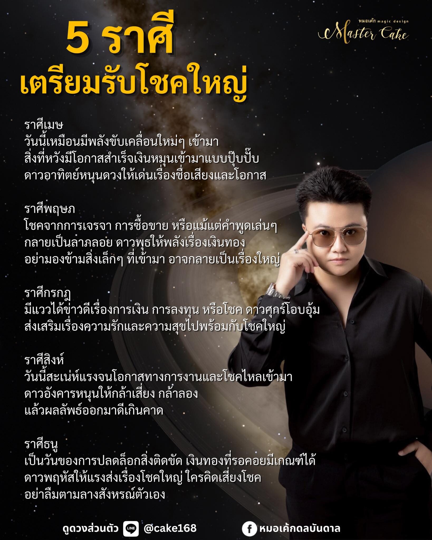 หมอเค้กดลบันดาล เผยถึงดวงชะตาราศี เตรียมรับโชคใหญ่ เหมือนมีพลังขับเคลื่อนใหม่ๆ เข้ามา สิ่งที่หวังมีโอกาสสำเร็จ เงินหมุนเข้ามาแบบปุ๊บปั๊บ ดาวอาทิตย์หนุนดวงให้เด่นเรื่องชื่อเสียงและโอกาส โชคจากการเจรจา การซื้อขาย หรือแม้แต่คำพูดเล่นๆ กลายเป็นลาภลอย ดาวพุธให้พลังเรื่องเงินทอง อย่ามองข้ามสิ่งเล็กๆ ที่เข้ามา อาจกลายเป็นเรื่องใหญ่