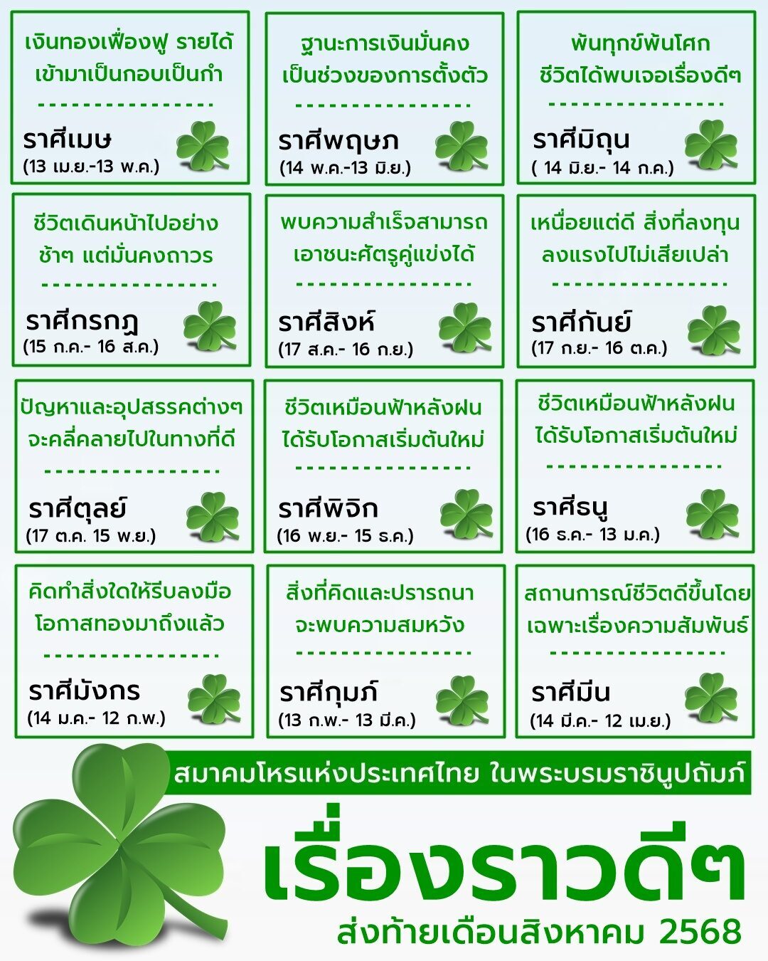 เมื่อวันที่ 28 ส.ค.68 สมาคมโหรแห่งประเทศไทย ในพระบรมราชินูปถัมภ์ เปิดดวง 12 ราศี เรื่องราวดี ๆ ที่จะได้ประสบ ส่งท้ายเดือนสิงหาคม 2568 ดังนี้
