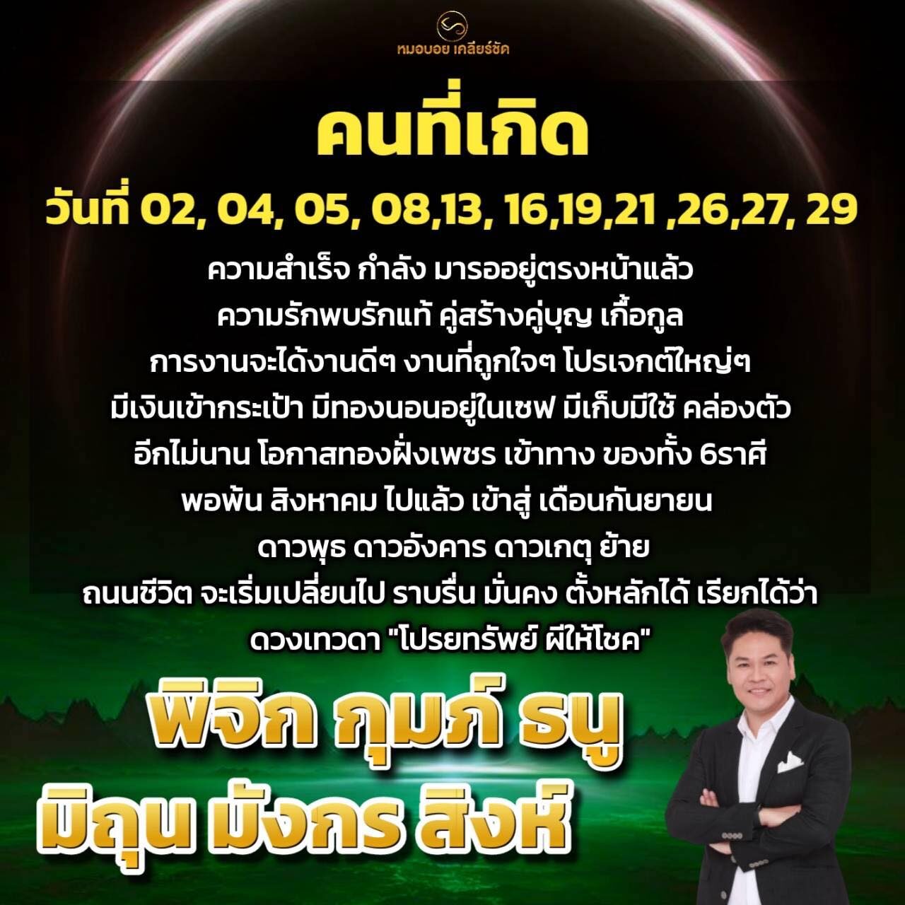 หมอบอย เคลียร์ชัด เผยถึงดวงชะตาราศี ความสำเร็จกำลังมารออยู่ตรงหน้าแล้ว ความรักพบรักแท้ คู่สร้างคู่บุญ เกื้อกูล การงานจะได้งานดีๆ งานที่ถูกใจๆ โปรเจตใหญ่ๆ มีเงินเข้ากระเป๋า มีทองนอนอยู่ในเซฟ มีเก็บมีใช้คล่องตัว อีกไม่นานโอกาสทองฝั่งเพชร เข้าทาง พอพ้นเดือนสิงหาคมไปแล้วเข้าสู่เดือนกันยายน ดาวพุธ ดาวอังคาร ดาวเกตุย้าย ถนนชีวิตจะเริ่มเปลี่ยนไป ราบรื่น มั่นคง ตั้งหลักได้ เรียกได้ว่าดวงเทวดาโปรยทรัพย์ ผีให้โชค