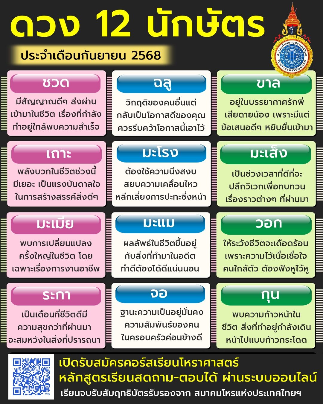 เมื่อวันที่ 3 ก.ย.68 สมาคมโหรแห่งประเทศไทย ในพระบรมราชินูปถัมภ์ เปิดดวง 12 นักษัตร ประจำเดือนกันยายน 2568 ดังนี้