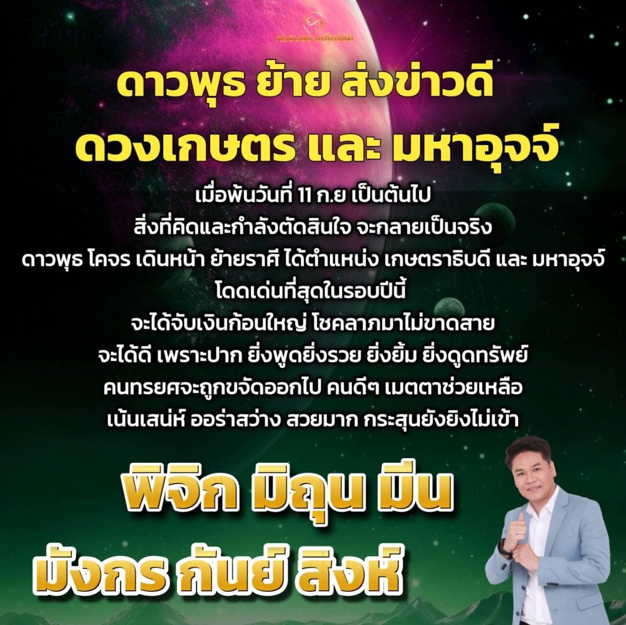 หมอบอย เคลียร์ชัด เผยถึงดวงชะตาราศี ดาวพุธย้ายส่งข่าวดี ดวงเกษตรและมหาอุจจ์ เมื่อพ้นวันที่ 11 ก.ย.เป็นต้นไป สิ่งที่คิดและกำลังตัดสินใจจะกลายเป็นจริง ดาวพุธโคจรเดินหน้าย้ายราศี ได้ตำแหน่งเกษตราธิบดีและมหาอุจจ์ โดดเด่นที่สุดในรอบปีนี้ จะได้จับเงินก้อนใหญ่ โชคลาภมาไม่ขาดสาย จะได้ดีเพราะปาก ยิ่งพูดยิ่งรวย ยิ่งดูดทรัพย์ คนทรยศจะถูกขจัดออกไป คนดีๆ เมตตาช่วยเหลือ เน้นเสน่ห์ ออร่าสว่าง สวยมาก กระสุนยิงไม่เข้า