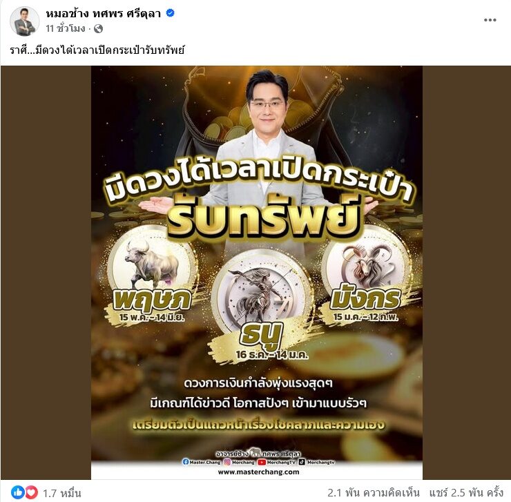 หมอช้าง ทศพร โพสต์ก่อนวันหวยออก เปิดราศีดวงรับทรัพย์ว่า “ราศี…มีดวงได้เวลาเปิดกระเป๋ารับทรัพย์”