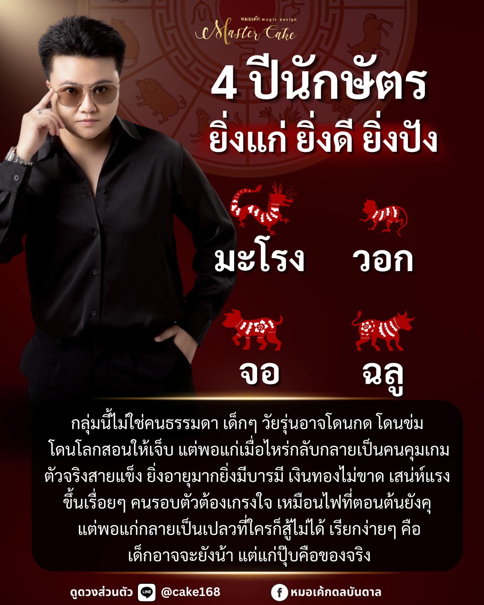 หมอเค้กดลบันดาล เผยถึงดวงชะตาราศี 4 ปีนักษัตร ยิ่งแก่ ยิ่งดี ยิ่งปัง กลุ่มนี้ไม่ใช่คนธรรมดา เด็กๆ วัยรุ่นอาจโดนกด โดนข่ม โดนโลกสอนให้เจ็บ แต่พอแก่เมื่อไหร่ กลับกลายเป็นคนคุมเกม ตัวจริงสายแข็ง ยิ่งอายุมากยิ่งมีบารมี เงินทองไม่ขาด เสน่ห์แรงขึ้นเรื่อยๆ คนรอบตัวต้องเกรงใจ เหมือนไฟที่ตอนต้นยังคุ แต่พอแก่กลายเป็นเปลวที่ใครก็สู้ไม่ได้ เรียกง่ายๆ คือ เด็กอาจจะยังน้า แต่แก่ปุ๊บคือของจริง