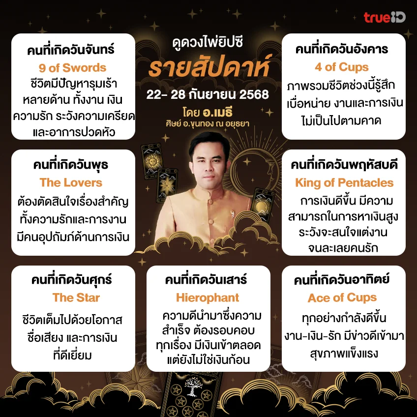 เปิดดวงไพ่ยิปซี รายสัปดาห์ ช่วงวันที่ 22- 28 กันยายน 2568 สัปดาห์นี้คนเกิดวันไหนที่ "มีผู้ใหญ่หรือคนรักอุปถัมภ์ด้านการเงิน" และดวงคนเกิดวันอื่นๆ จะดีด้านใดกันบ้าง หรือมีประเด็นอะไรต้องระวังเป็นพิเศษ มา ดูดวงรายสัปดาห์ กับ อ.เมธี ศิษย์ อ.ขุนทอง ณ อยุธยา 0915945646 กันเลยได้ มีคำทำนายมาให้ครบ! สำหรับคนเกิดทั้ง 7 วัน ทั้ง ดวงการงาน ดวงการเงิน ดวงความรัก และ ดวงสุขภาพ