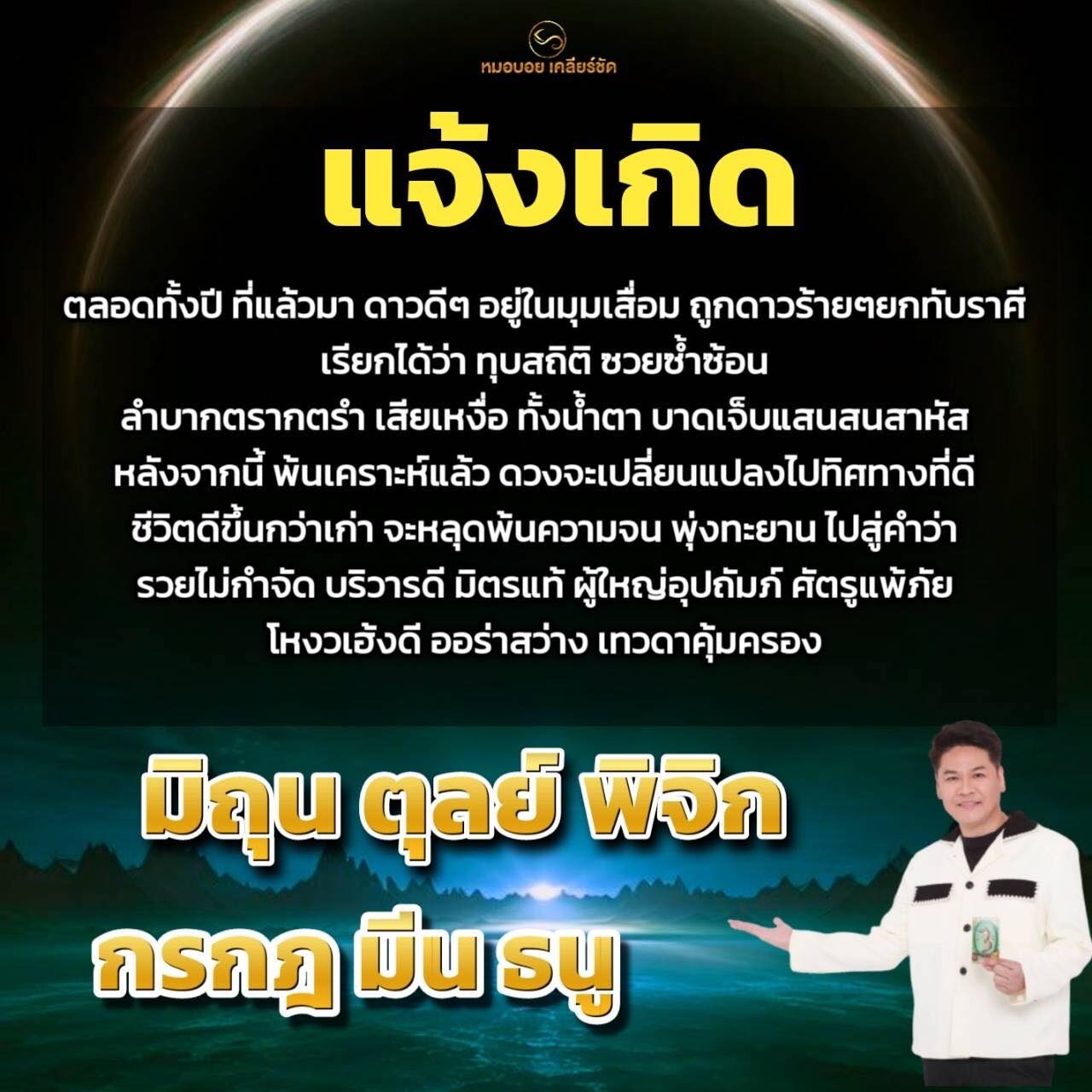 หมอบอย เคลียร์ชัด เผยถึงดวงชะตาราศีแจ้งเกิด ตลอดทั้งปีที่แล้วมา ดาวดีๆ อยู่ในมุมเสื่อม ถูกดาวร้ายๆ ยกทับราศี เรียกได้ว่าทุบสถิติ ซวยทับซ้อน ลำบากตรากตรำ เสียเหงื่อ ทั้งน้ำตา บาดเจ็บแสนสาหัส หลังจากนี้พ้นเคราะห์แล้ว ดวงจะเปลี่ยนแปลงไปทิศทางที่ดี ชีวิตดีขึ้นกว่าเก่า จะหลุดพ้นความจน พุ่งทะยานไปสู่คำว่ารวยไม่จำกัด บริวารดี มิตรแท้ ผู้ใหญ่อุปถัมภ์ ศัตรูแพ้ภัย เทวดาคุ้มครอง