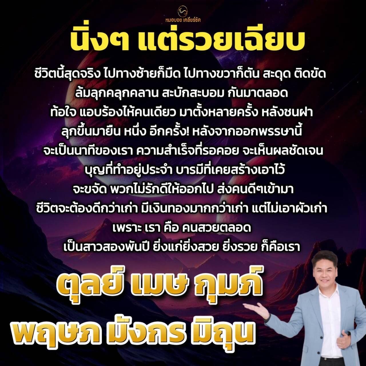 หมอบอย เคลียร์ชัด เผยถึงดวงราศี นิ่งๆ แต่รวยเฉียบ ชีวิตนี้สุดจริงไปซ้ายก็มืด ไปทางขวาก็ตัน สะดุด ติดขัด ล้มลุกคลุกคลาน สะบักสะบอมกันมาตลอด ท้อใจ แอบร้องไห้คนเดียวมาหลายครั้ง หลังชนฝา ลุกขึ้นมายืนหนึ่งอีกครั้ง หลังจากออกพรรษานี้ จะเป็นนาทีของเรา ความสำเร็จที่รอคอยจะเห็นผลชัดเจน บุญที่ทำอยู่ประจำ บารมีที่เคยสร้างเอาไว้ จะขจัดพวกไม่รักดีออกไป ส่งคนดีเข้ามา ชีวิตต้องดีกว่าเก่า มีเงินทองมากกว่าเก่า
