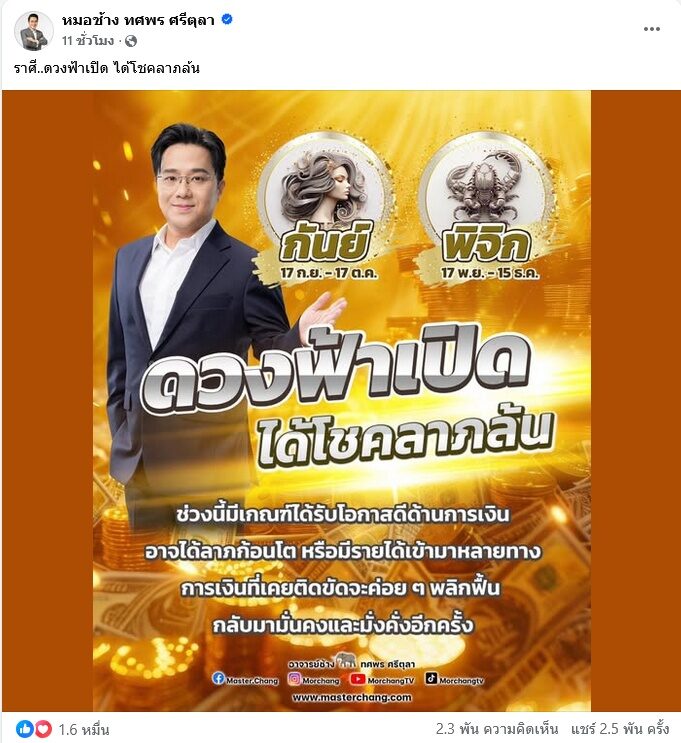 ราศีไหนจะรวยรับวันหวยออก หมอช้าง ทศพร โพสต์ในคืนก่อนวันหวยออกงวดวันที่ 16 ตุลาคม 2568 ถึงข่าวดีกับ 2 ราศีด้วยว่า “ราศี..ดวงฟ้าเปิด ได้โชคลาภล้น”