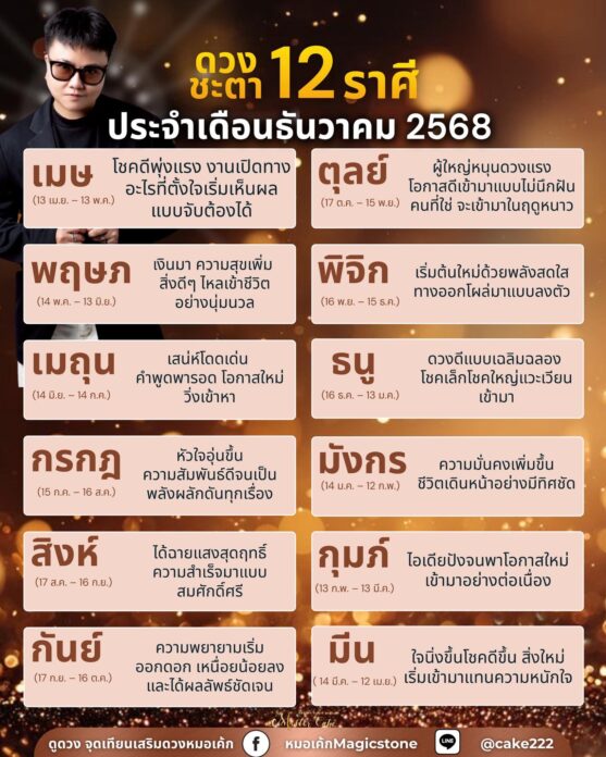 หมอเค้กดลบันดาล เปิดดวงชะตา 12 ราศี ประจำเดือนธ.ค.68 ส่งท้ายปีด้วยพลังดี ๆ ให้หัวใจได้พัก และให้ดวงได้พุ่งอีกครั้ง ความเฮงของเดือนธันวาคม 2568 มาถึงแล้ว ให้ทุกคนรับพลังดี ปิดปีอย่างสวยๆ และเริ่มต้นใหม่อย่างสว่างที่สุด
