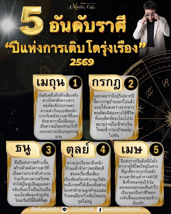เมื่อวันที่ 25 ม.ค.69 หมอเค้กดลบันดาล เปิด 5 อันดับราศี ปี 2569 เป็นปีแห่งการเติบโตรุ่งเรือง