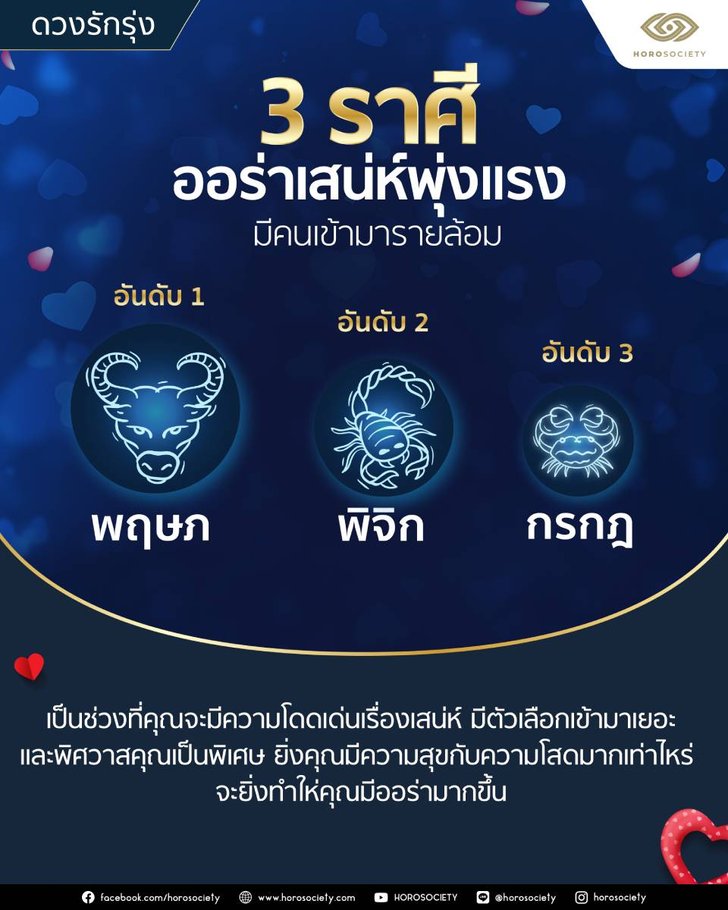 ที่มา : ดวงรักรุ่ง 3 ราศี ออร่าเสน่ห์พุ่งแรง มีคนเข้ามารายล้อม โดย Horosociety (sanook.com)