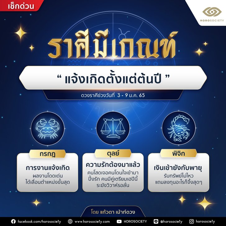 - ราศีกรกฎ : การงานแจ้งเกิด ผลงานโดดเด่น ได้เลื่อนตำแหน่งขั้นสุด