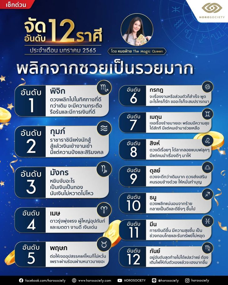 ที่มา : จัดอันดับ 12 ราศี พลิกจากซวยเป็นรวยมาก! เดือนมกราคม 2565 โดยหมอฝ้าย The Magic Queen (sanook.com)