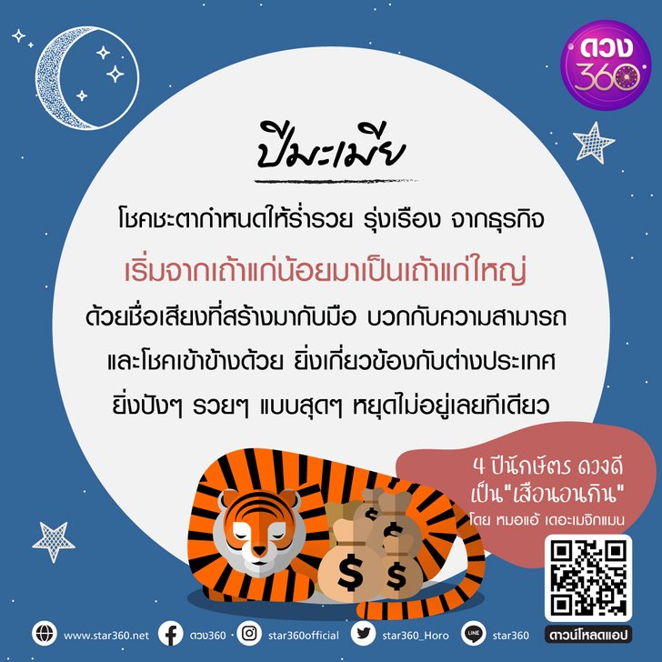 ปีมะแม : ดวงแจ้งเกิดจากความรักเป็นอุปถัมภ์ คิดเงินได้เงิน คิดทองได้ทอง ถึงเวลาเป็นเศรษฐีใหม่ ที่สุดยอดกว่านั้นคือจะได้อสังหาริมทรัพย์ หรืออาจได้มีบ้านในต่างประเทศด้วย โดยรวมแล้วในปีนี้จะเป็นเสือนอนกินแน่นอน เพราะผ่านช่วงเวลาลำบากมาแล้ว
