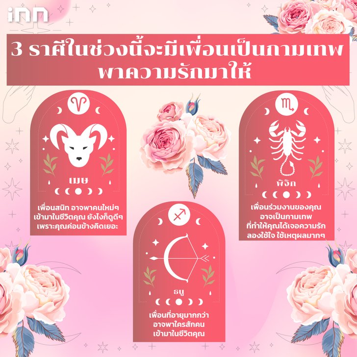 จบไปแล้วทั้ง 3 ราศี พอนึกออกไหมว่าเพื่อนคนไหนกันนะ ที่จะพาเราไปเจอกับความรัก ยังไงก็ขอให้ทุกคนโชคดี ใครที่มีความชอบในการอ่านดวง อยากเสริมดวง เสริมโชคลาภในรูปแบบอื่นๆ สามารถติดตามได้ที่นี่ iNN Horoscope